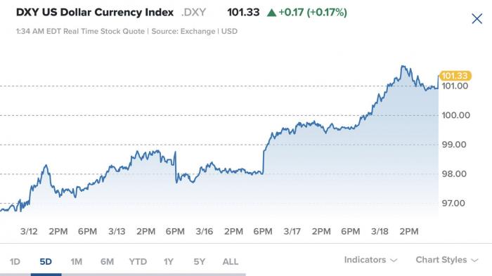 美元指数一路上扬,重返100大关后涨势不止,日内涨幅扩大至1%。美元走强拖累现货黄金短线跌幅扩大至10美元。
