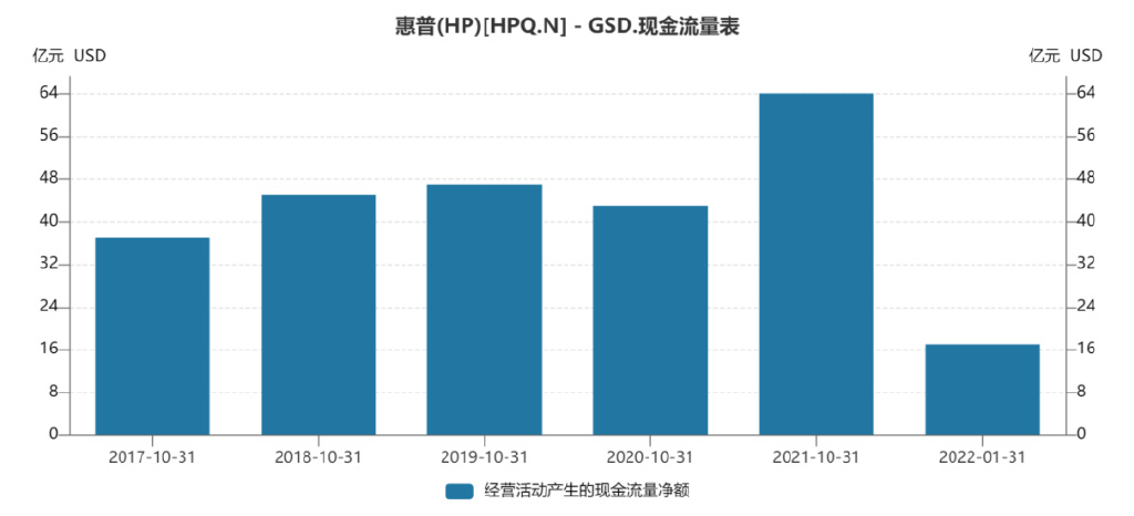 有人惊讶于巴菲特又买了一个科技股,但惠普其实更像是一个消费股。PC市场是一个成熟市场,行业规模基本平稳。惠普稳居行业老二的位置,已经是一家成熟公司,未来预期增长也是个位数。这样的行业和稳定的格局很难折腾出一朵花来,所以这样的情况给公司带来的就是每年稳定的现金流。惠普每年经营现金流净额都有几十亿美元,去年受惠居家办公飙升到64亿美元。未来即使回落,大概率每年也会有四五十亿的现金流。