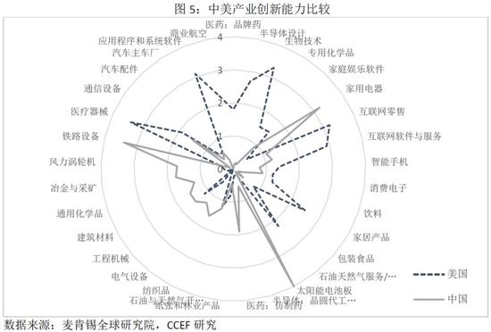在33个产业的创新领域中,我国目前在家电、建材、铁路、风电、太阳能和石油天然气等十余个领域领先于美国,但其他20多项技术领域都弱于美国,尤其在商业航空、半导体、生物技术、特种化学品和系统软件等技术领域,和美国的差距十分明显。