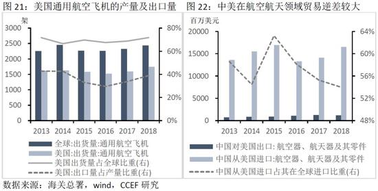 美国是全球飞机制造的第一大国,其中的40%用于对外出口,中国是美国飞机出口的第一大国,2017年,美国波音飞机全球产量的26%出口至中国,贸易额约600亿元。2018年,全球通用航空飞机72%的出货量来自美国。同年,中国从美国进口航空器、航天器及相关设备零件165亿美元,该领域的出口只有12亿美元,贸易逆差达153亿美元。从优势机种来看,我国偏向战斗机与无人机,战斗机数量全球第三、无人机全球第二。而美国则擅长跨航运输能力强的加油机与运输机,在商业航空领域拥有优势地位。
