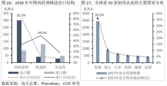 中国是世界上最大的仿制药生产国,全国4300余家原料药和制剂生产企业,其中90%以上是仿制药企业(品牌药基本依赖进口)。从研发费用占营收比例来看,而国内大型药企研发投入比大多都在5%以下(美国前十大公司平均水平为18%)。中美在产业基础和研发支出投入的差异性导致了两国市场结构的不同,中国生产的仿制药成本较低,以价格竞争和广告销售为主,美国则在创新药方面采取高价策略。从全球前50家制药企业的销售情况来看,美国拥有绝对的优势地位,共有16家企业进入全球前50强,占全球市场份额的36%。目前来看,中国在高端医药制造方面与国际水平差距甚远。