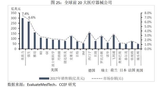 美国在全球医疗器械市场拥有垄断性的地位,其销售规模占全球半壁江山。相比之下,中国的占比不足20%。同时,医疗器械行业集中度高,全球前20大公司的市场份额高达55%。其中,美国共拥有10家,市场份额共计28.3%(此前拥有全球第一的美敦力公司,但2014年其总部迁移至爱尔兰)。德国、瑞士、荷兰、日本的市场份额仅分别为5.7%、4.5%、3.4%和2.6%,虽然在部分领域中国已经开始逐步走向进口替代,但是在以CT、磁共振为主的大型设备领域,我国的核心技术与国际领先水平还有一定的差距。