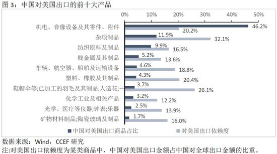 中国向美国出口的产品中,机电产品、杂项制品、纺织服装制品共占68%。其中,机电产品比重高达46.2%,美国是我国机电产品最大出口市场(占比20%)。中国从美国进口的机电产品多为电子元器件等核心零部件,在国内采用加工贸易的方式再以最终品的形式出口至美国,赚取产业链中最底部的附加值。同时,从中国出口商品目的地来看,前十大出口商品对美国出口比重均在10%以上,其中最高的为杂项制品,如家具、玩具等,对美国出口的依赖度高达32%。