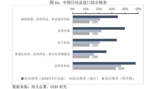 在消费零售行业,中国拥有完整的工业链基础关税,国产品牌在家具、建筑装潢、家居日用、大家电等领域占有较高的市场份额。但在数码、运动、文化娱乐、日用化妆品等中高端消费品,尤其是奢侈品领域对国外品牌的需求较大。2018年,中国奢侈品消费金额达1170亿元,占全球1/3的市场份额,其中仅有27%来自境内。由于商品进口环节要缴纳关税、消费税及增值税,即便在日用品进口关税大幅下调的情况下,其综合税率也普遍在20%以上。而国外免税店售价一般较国内专柜减少20%-30%,是中国旅行者购物消费的主要渠道(占比37%)。近年来由于跨境电商零售进口税收规定,在限额以内实行零关税,增值税及消费税按应纳税额的70%征收,部分奢侈品通过跨境电商的平台进口。以化妆品税收为例,普通化妆品和高档化妆品的进口综合税率分别为9%、23%,较一般贸易的进口综合税率分别减少7.2%、13.7%。