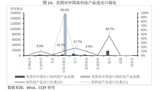 近年来,高科技产业占中国对外贸易的比重持续增加。2018年,中国高科技产品进出口总额约为对外贸易总额的30.7%。中美国高科技贸易中,中国对美国出口的90%均为信息通讯类产品。而美国对中国出口的高科技产品主要为航天类,占比46.7%。其余产品则相对分散,电子、信息通讯、柔性制造以及生命科学基本占比都在10%以上,多集中于核心材料和零件。