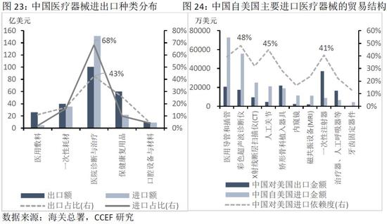 2018年,医疗器械类商品在中国医药行业进出口总额的比重达40%,从进出口商品分布来看,中国出口产品主要为医用耗材敷料以及保健康复用品等低端产品,而进口额的68%都来自医疗设备领域。美国是我国医疗器械的主要进口来源地,中国主要从美国进口高端医疗设备(如彩超、X射线断层检查仪等)以及高值医用耗材。在重要进口商品中,中国对美国的依赖度基本在20%以上,其中彩超、人工关节、一次性注射器的进口依赖度高达40%。