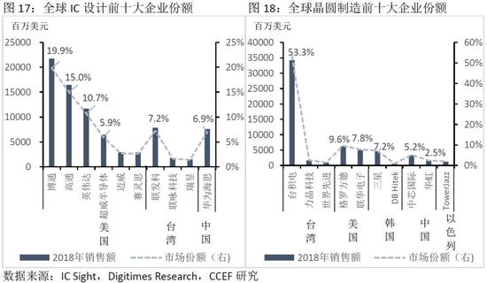 一般来说,集成电路生产中关税,除去垂直一体化模式下的IDM,其产业链可以分为设计、制造、封测三个环节,在中国市场中这三大环节的份额分别为38.6%、27.8%、33.6%。在IC设计企业中,2018年华为海思在IC设计领域的全球份额为6.9%,位列第5位。除此之外,紫光展锐也位于国际前列。美国则在IC设计领域表现出垄断性的优势,在全球前十大企业中拥有6家,市场份额为57%。晶圆制造是中国最大的短板,台积电是全球第一大晶圆代工公司,2018年销售额占行业的53.3%。而中芯国际和华虹的市场份额不足8%,均弱于美国和韩国。最后,封测是中国发展最成熟的一块,长电科技、华天科技、通富微电三大封测巨头在市场位于第三名、第七名和第八名。