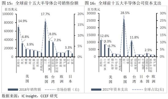 2018年全球15大半导体公司中,三星以833亿美元占据全球最大销售额(17.7%),美国在前15大公司中拥有英特尔、美光等5家公司,共占据市场37%的份额。而从预测未来2-3年半导体产业景气程度的资本支出来看,2017年中芯国际凭借23亿美元的资本支出,位列全球第6位,但与三星、英特尔、台积电上百亿的资本支出规模相去甚远。