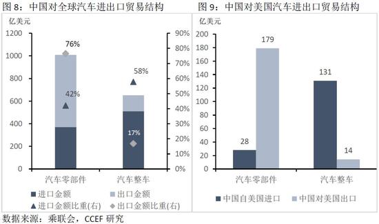 我国汽车贸易主要分为汽车零部件和汽车整车市场。其中,汽车零部件主要以出口为主,汽车整车以进口为主。2017年,汽车零部件出口金额占汽车出口贸易金额的76%,汽车整车进口金额占汽车进口贸易金额的58%。其中对美汽车零部件贸易为中国贡献151亿元的贸易顺差,而对美汽车整车贸易则为中国带来117亿美元的贸易逆差。