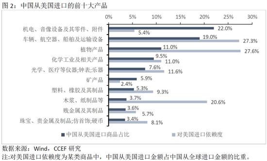 中国主要从美国进口机电产品(22%)、交通运输设备(19%)、植物产品(11%)、化工产品(9.5%)、光学设备(7.6%)等商品。从进口依赖度看,中国从美国进口的交通运输设备、植物产品总量占其在全球进口量的27%。植物产品主要为黄大豆、棉花和高粱等,其中黄大豆进口量占自美国进口农产品的70%以上。化工产品、光学设备等对美国进口的依赖度也均在10%以上。