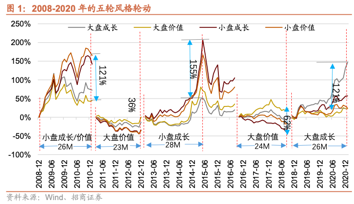 A股存在明显的风格轮动,是决定中期投资收益重要的影响因素。从过往历史来看,2008年至2020年,A股共经历了五轮明显的风格轮动: