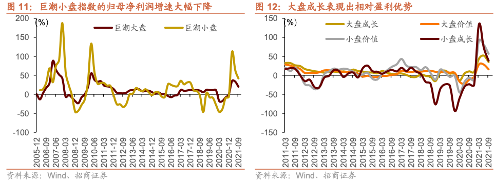 从三季度各风格指数的盈利情况看,小盘指数的盈利增速出现较大幅度回调。同时,大盘成长的盈利表现出相对优势。
