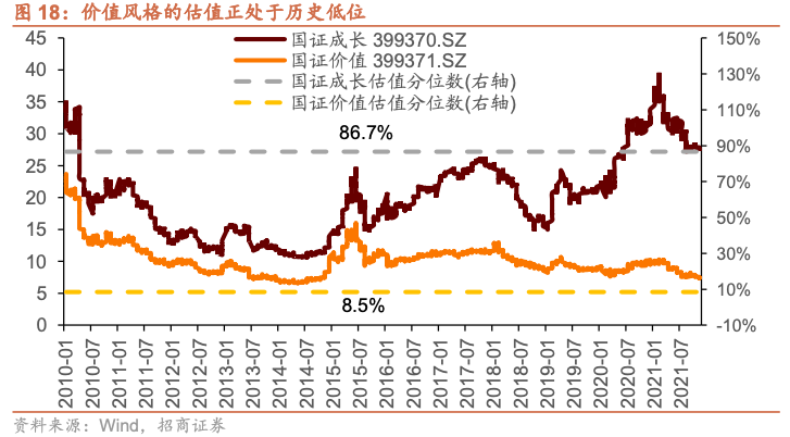 但是,当前成长风格与价值风格的分化已经较为极致,价值风格回归具有更大可能性。就市场表现出来的成长价值风格而言,成长风格和价值风格存在比较明显的周期性切换。2012年-2018年期间,价值风格明显跑赢,相对成长风格超额收益明显。自2019年以来,成长风格表现亮眼。目前,国证价值指数与国证成长指数的比值已经达到历史底部,并且,从估值来看,当前国证成长指数的估值处于历史86.7%分位,而国证价值指数的估值仅处于历史8.5%分位,两者的分化已经非常极致。因此,我们认为未来价值风格回归的概率较大。