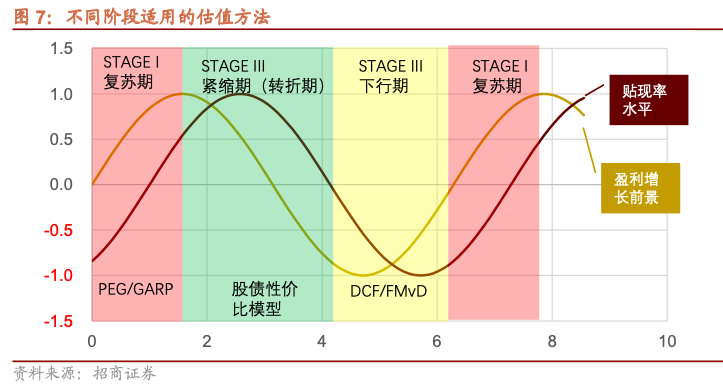 经济复苏阶段,利率上行,盈利改善,适用PEG方法,但成长/价值风格不确定,更需要关注盈利增长与估值的匹配程度。紧缩期利率高位,盈利见顶回落,适用股债相对性价比模型,高股息板块相对抗跌,且当股息率相对贴现率更有优势,高股息板块上涨,价值、低估值风格占优。下行期流动性好,适用DCF及FMvD模型,这两个模型已经超越PB/PE框架,长期稳定增长或空间大的板块受益于利率下行而估值提升,成长、高估值占优。