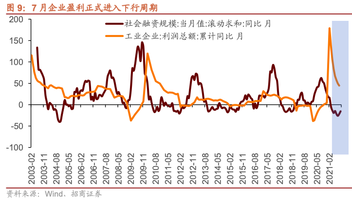 9月以来,随着8月经济数据的发布,经济确认进入下行期。8月份,规模以上工业增加值同比实际增长5.3%,规模以上工业企业实现利润总额同比增长10.1%,较7月再次下滑。与此同时,新增社融增速自年初以来明显下行,按照新增社融增速与工业企业盈利之间大概有6个月的领先滞后关系,后续的企业盈利将持续转弱。并且,由于政策对地产的强监管以及财政后置等原因,7月以来的新增社融数据均较弱,这将较大的影响后续经济反弹。