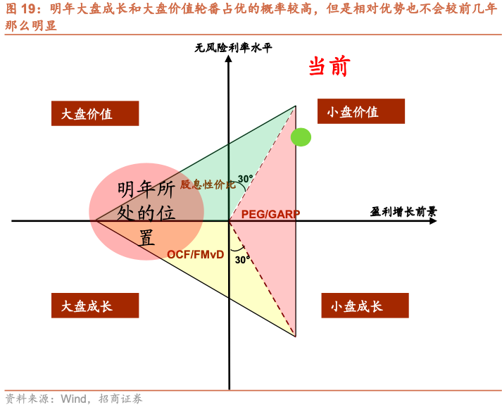 成长与价值风格方面,明年呈现盈利增速下行和流动性持续改善的态势,风险偏好难以明显抬升,但也不至于由于流动性杀估值,估值方法角度而言投资者并无明显偏好,明年的风格可能会更加均衡,呈现价值和成长轮动的特征。