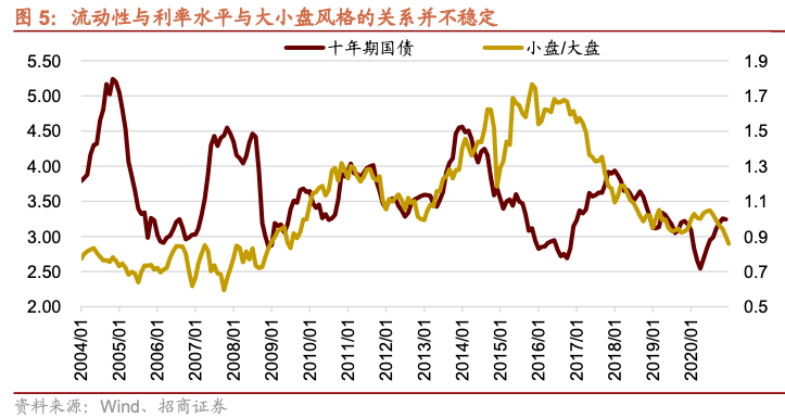 在不少投资者心中,往往把小盘风格与流动性挂钩,认为流动性宽松则市场呈现小盘风格,反之呈现大盘风格。但是,从历史数据来看,如果以利率作为流动性的一个代表,大小盘与流动性的关系并不稳定,并没有明显的相关性。