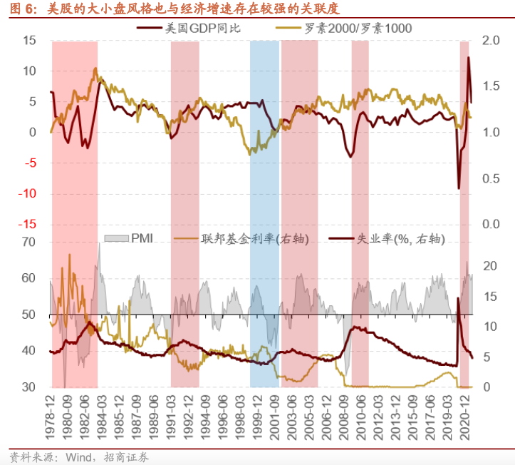 美股也存在同样的规律。罗素3000指数是罗素公司提供的3000个美国股票的市场指数,其中最大的1000只作为罗素1000,剩下2000作为罗素2000,罗素2000代表了小盘股指数。从下图可以看出,罗素2000占优即小盘占优多出现美国经济触底回升,失业率见顶回落的阶段,而大盘指数则反之,在经济较为低迷阶段,大盘相对占优。