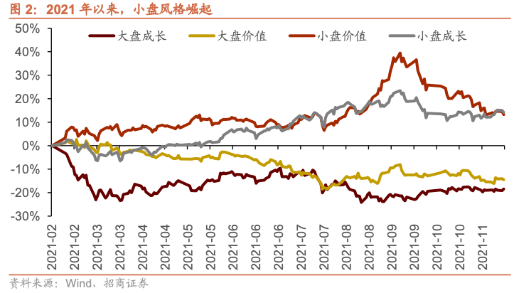 2021年2月以来,小盘风格再度崛起。疫情以来,随着我国宽松货币政策与财政政策的推进,以及海外需求对我国出口的拉动,企业盈利加速上行。与此同时,央行货币政策回归中性之后,一直相对宽松,小盘风格崛起。