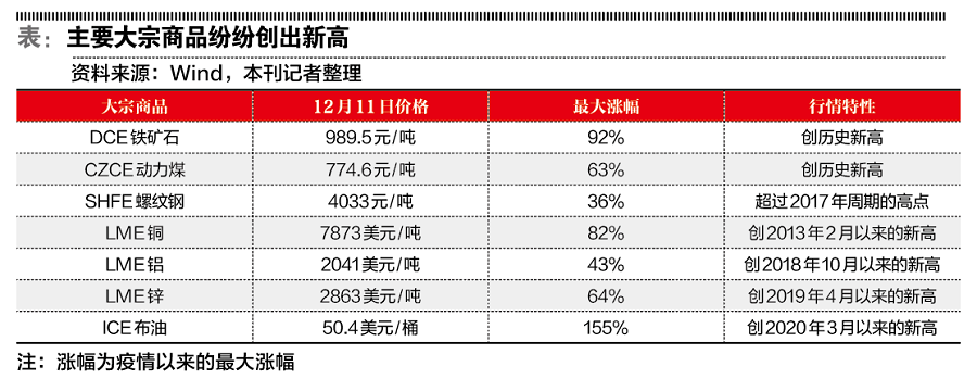 近期,铁矿石、动力煤期货价格双双创出历史新高,铜价也超过了前几轮周期的高点,铝、锌、螺纹钢等商品价格从疫情底部的上涨非常惊人,商品货币澳元亦气势如虹。