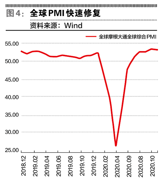 全球经济从三季度也开始快速恢复。11月摩根大通全球综合PMI为53.1,已经超过疫情前的水平。在三季度,美国GDP环比折年率高达33.1%,欧元区GDP环比增长为12.5%,日本GDP环比增长5.3%。