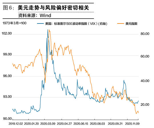 2020年,美元指数与标普500波动率指数(VIX)存在明显的正相关。VIX上升时,表明全球经济金融风险上升,伴随着美元升值;VIX下降时,表明全球经济金融风险下降,美元随之贬值。
